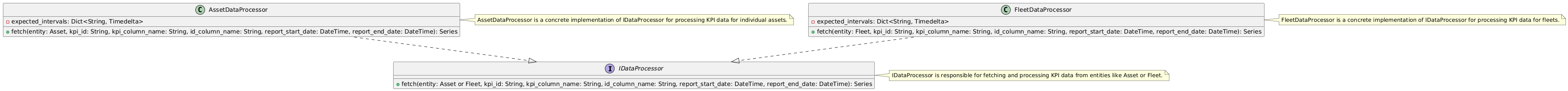 An interface IDataProcessor defines the method fetch, which retrieves data for an asset or fleet.
